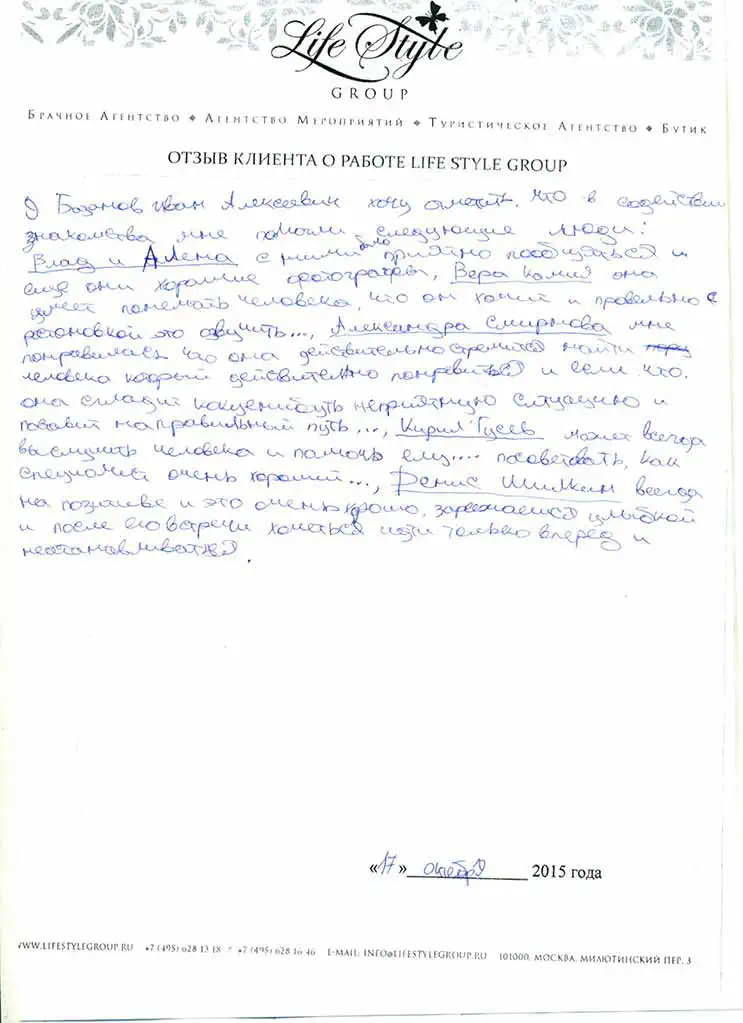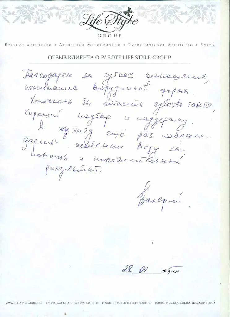 "Если Вы еще одиноки и мечтаете найти свою вторую половинку и быть такими же счастливыми как мы, то обращайтесь в компанию Life Style Group, где работают настоящие профессионалы, которые помогут Вам обрести свое счастье!"
